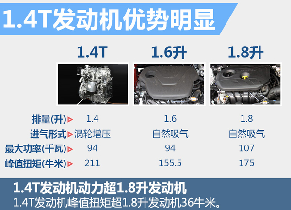 北京现代领动首次搭载1.4T涡轮增压发动机,这款发动机最大功率约为94千瓦、最大扭矩211牛米,现款朗动则采用1.8升和1.6升自然吸气发动机,1.8升版最大功率约为107千瓦、最大扭矩175牛米,1.6升版最大功率约为107千瓦、最大扭矩175牛米。相比之下,1.4T引擎虽然在最大功率方面略显不足,但其最大扭矩超过1.8升发动机,甚至与2.0升自然吸气发动机不相上下。