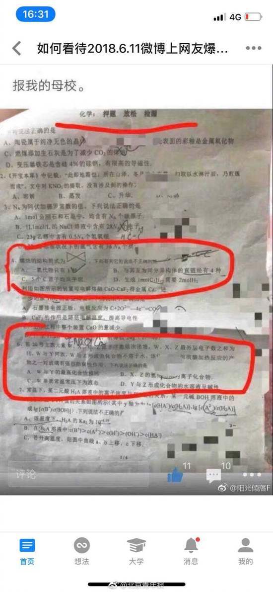 据北京青年报6月13日消息,近日,有网友爆料称,东莞市东华高级中学泄露高考理综试题。“学校高考前一天发给我们一套化学卷,说是押题方式,让我们不要写,只要背答案理解原理就好,没想到考理综时真遇到了原题。”对此爆料,有网友评论称”那两个选择题确实有较大泄题嫌疑”,也有网友称”高考题目不可能泄露,遇到相似题目真的太正常”。