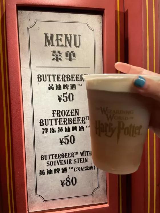 哈利·波特的魔法世界景区内,人气小吃:黄油啤酒或黄油啤酒冰沙,价格为一杯50元⬇。