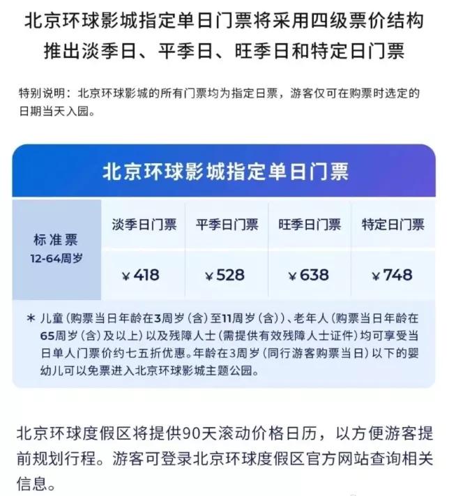 北京环球影城指定单日门票将采用四级票价结构,推出淡季日、平季日、旺季日和特定日门票。