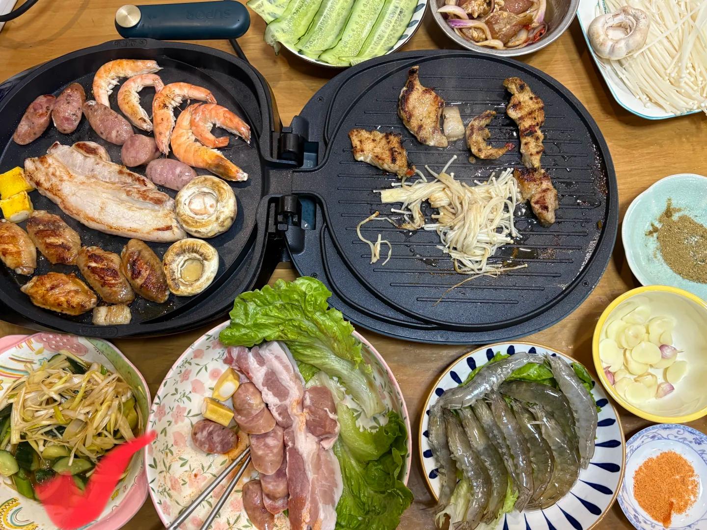 在家想吃烤肉电饼铛就是家庭版的烤肉神器,。一面可以烤肉,一面可以烤菜,太好用了,准备好想要吃的食材腌制肉类,然后将电饼铛完全打开。