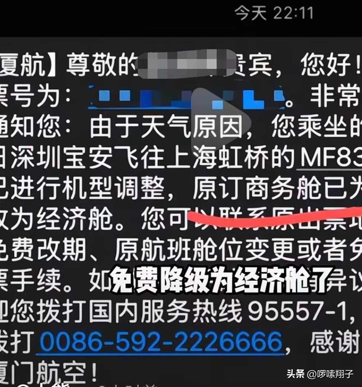 5月8日一名博主发视频称自己本来乘坐5月6号的厦门航班,再从深圳机场飞往上海的时候,竟然收到了一条免费降舱的短信。