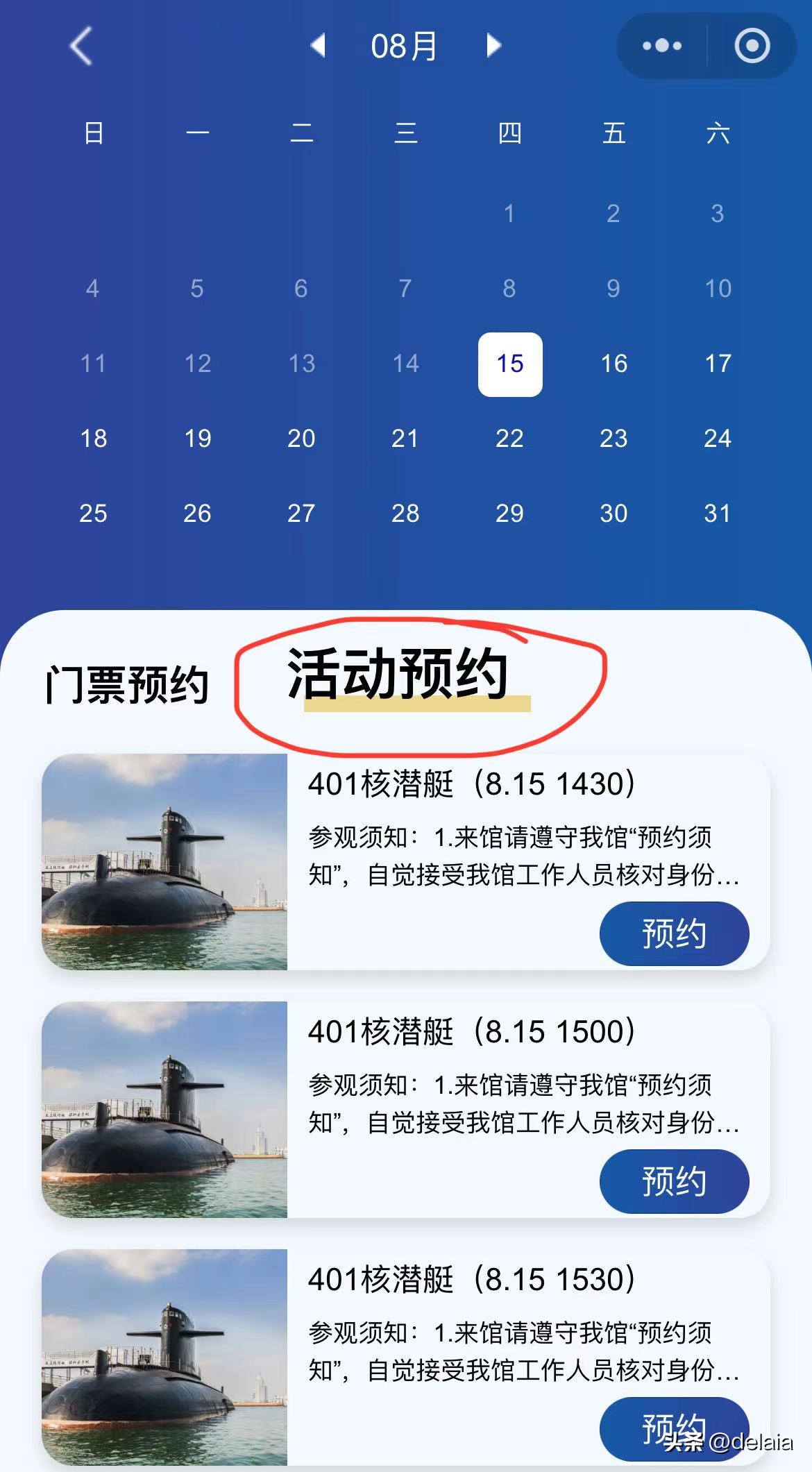 参观核潜艇需要在活动预约模块单独预约,每周一下午17时免费抢核潜艇参观门票。官微“参观导览”-“门票预约”或者小程序“在线预约”中选择本周二至周日的“活动预约”,然后就是拼手速了。参观时长为30分钟左右,全程不收取任何费用。成功预约潜艇参观票后无需再次预约当日门票。