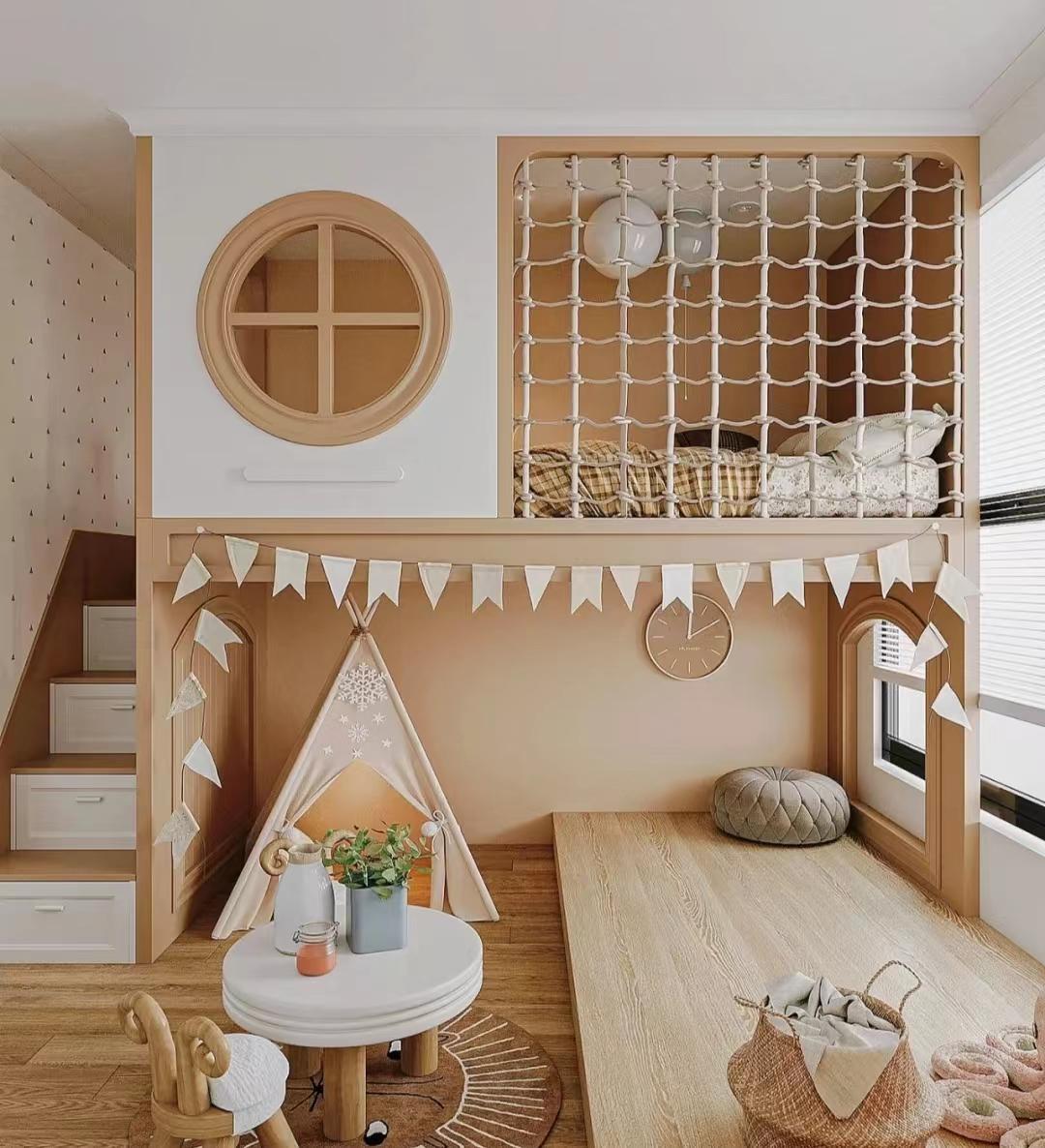 如果还不知道如何着手改造家庭游乐场,高低床也是不错的选择,因为它可以轻松的把空间分为上下两层,上层睡眠区,下层游乐场。而作为两个空间的连接体,楼梯可以选择做成娱乐滑梯,或者抽屉步梯这类对于宝贝来说安全性更高的设计。