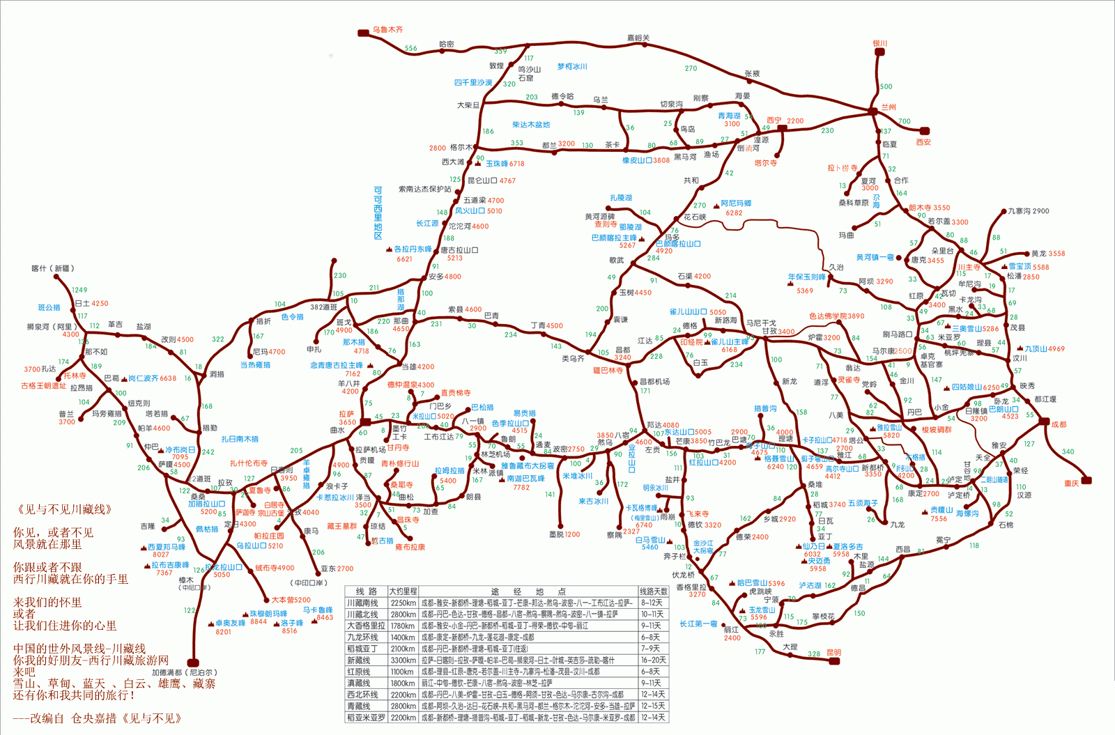 中国最美的地方在哪,我认为就在川滇藏这一片风景。又是一年西部最美风景的季节来临,现将西部最美景观的川滇藏史上最详尽的路线图分享给大家,上面有各处雪山的海拔和各路线之间的距离,一图在手,一网打尽西部所有风景,游遍中国最美西部。