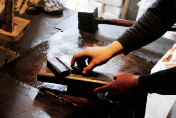 第二次 对墨进行敲打,增加墨 的韧性,经过再次捶打后,墨坯手感细腻、柔和,表面开始出现光泽。一般捶打时间为 4 ~ 5分钟。