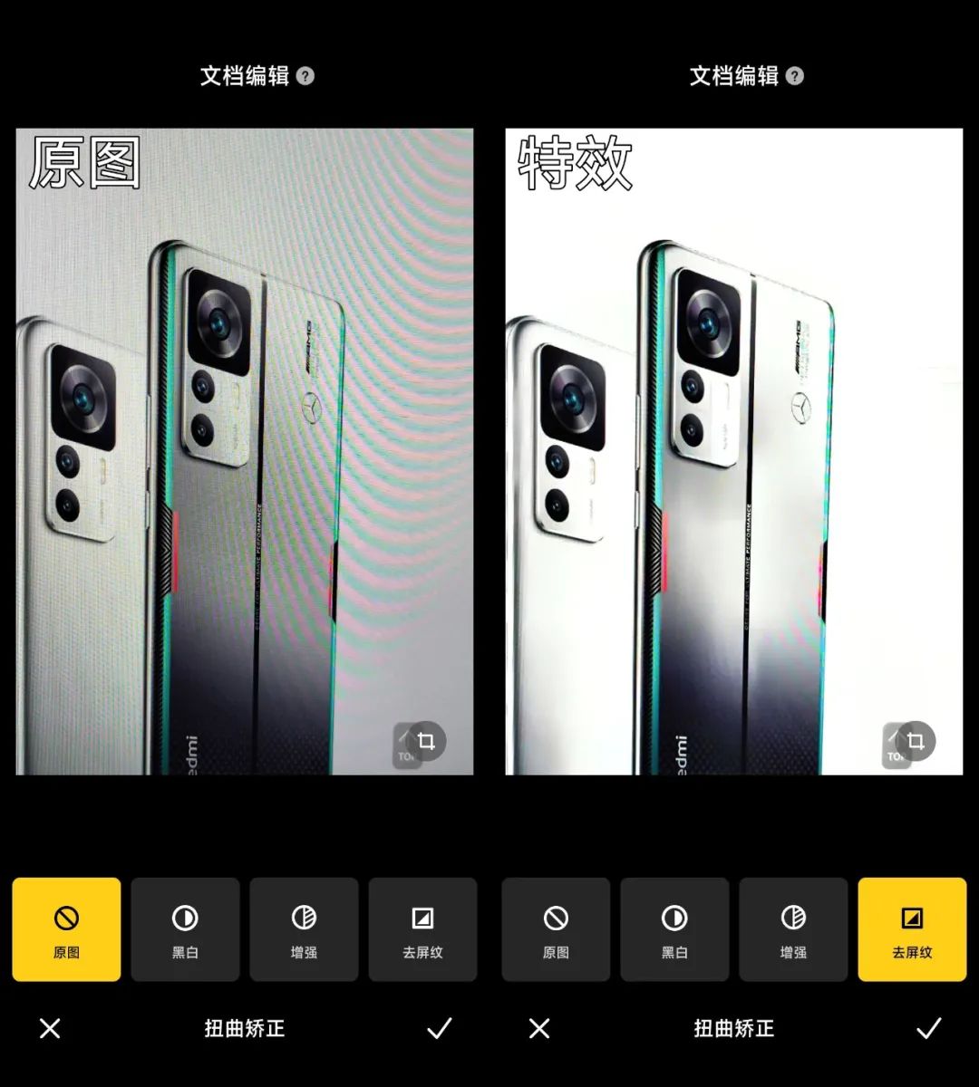 功能入口:先打开一张图片,再点击「更多-文档编辑-去屏纹」。