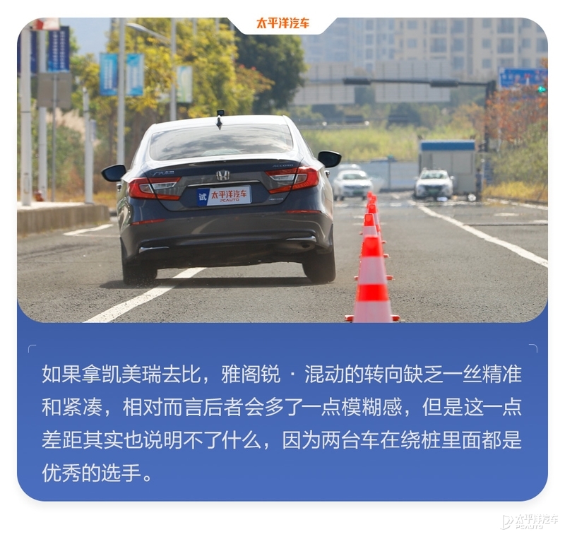 以时速60km/h的速度进行绕桩测试,对于雅阁锐·混动来说毫无压力,凭借灵巧车身还有扎实的底盘设定,虽然它没有精准、紧致且灵敏的转向手感,但也没有妨碍它在进行绕桩,有着柔和般走线。车身跟随性接近完美的表现,可以堪称“人车合一”,类似的表现和凯美瑞相似,但转向手感和凯美瑞相比就差一点,但都已经表现优秀。