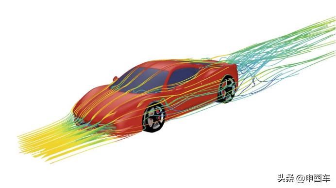 图:建模后的气流示意图,硬顶版458 Italia的阻力系数为0.33,最大可以获得360公斤的下压力。