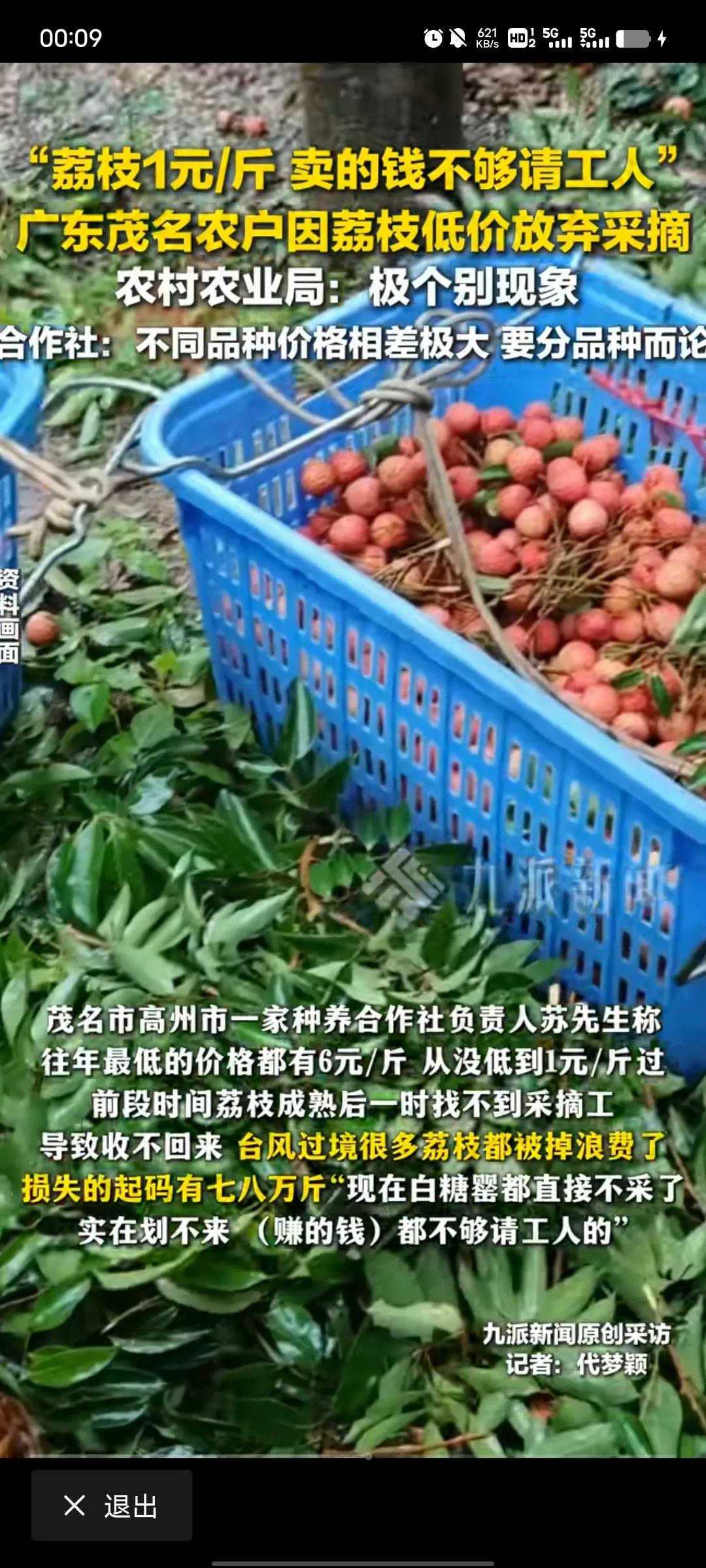 最近网上说广东荔枝价格跌得厉害,有农户卖一斤不到一块钱,连请工人的钱都不够。这事发生在茂名那边,听说是因为今年荔枝长得太多了,加上台风把树上的果吹了不少下来。我简单查了下,今年广东荔枝预计产量接近两百万吨,比往年多了好多。