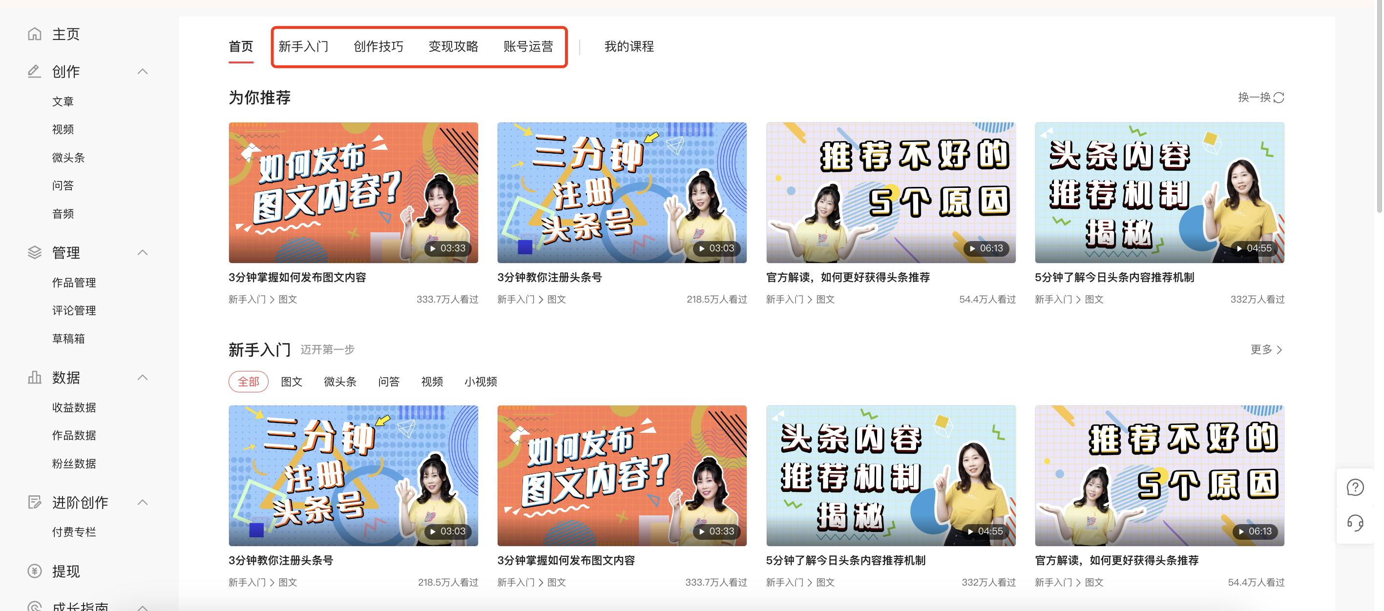 - 课程助力成长:点击首页【推荐课程】,即可看到头条官方为创作者提供的创作指导免费系列课程,课程涵盖多种内容体裁及多个领域,从平台规则、推荐原理到爆款技巧、涨粉方法,手把手助力作者成长~