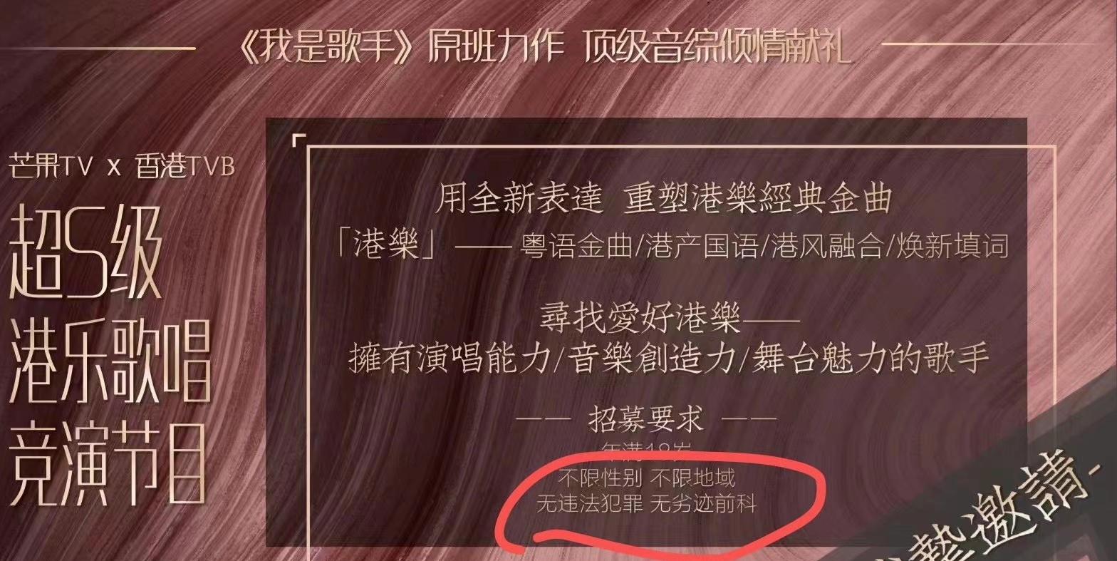 为避免乱用污点和潜在危险艺人导致节目被封,也为了拯救后期小哥的头发,芒果TV《我是歌手》节目原班人马和TVB共同出品的港乐主题的音综《声生不息》,这回大张旗鼓的将“无违法犯罪”和“无劣迹前科”明确的公开标注在招募要求里。虽然这个节目班底很让人期待,然而这个明文规定的标准却让人莫名心酸又好笑。