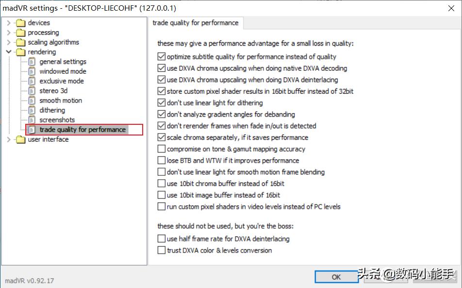 第8项是如果能节省效能的话把色度升降频分开处理,里面唯一一个我觉得中高阶卡也可以勾选的,这个选项的效果,举例来说,一个4K 4:2:0的影片要在FHD屏幕播放,一般来讲要先把色度分量(1920*1080)升频到4K再跟亮度分量一起降频到FHD,勾选这个选项的话,色度分量直接维持1920*1080不动,而亮度分量3840*2160直接降频到1920*1080,对4K影片来说,少了这个色度升频动作节省的效能非常多,对画面质量影响却不多。