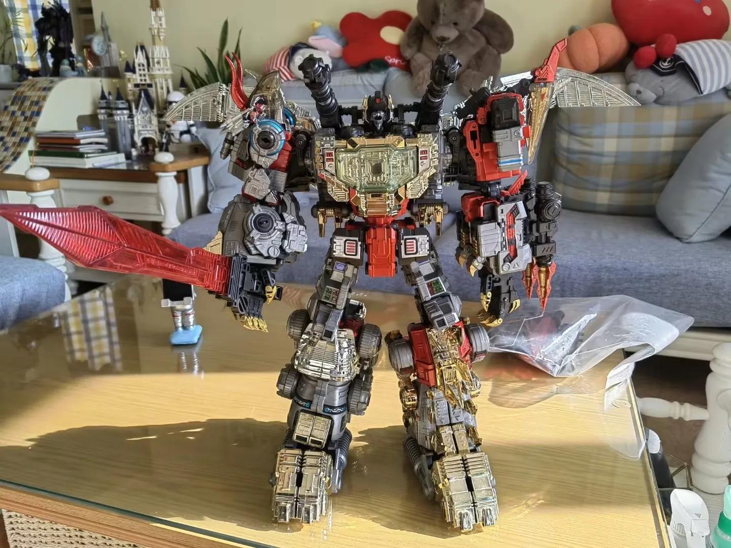 这款给我的感觉,三千块的话,我是绝对不会买的,一千到一千六七左右,性价比就很好了,毕竟它的单体真的是mp级别,它没有依靠合体配件,这也是它松散的问题,太重了,如果和官方出的那些合体一样轻飘飘,肯定不会有这个问题,另外一点,就是他的配色金光闪闪,很豪华,跟其他组合体完全不是一个风格,涂装跟现在的藏玩阁蚩尤很像,只是它用的是电镀,很漂亮,头雕好看是一个加分项,大脚板机械感十足,正式因为它的性价比,和能够站稳的前提下,我把暗黑配色的绝创修罗王也买了,这个是全新的。