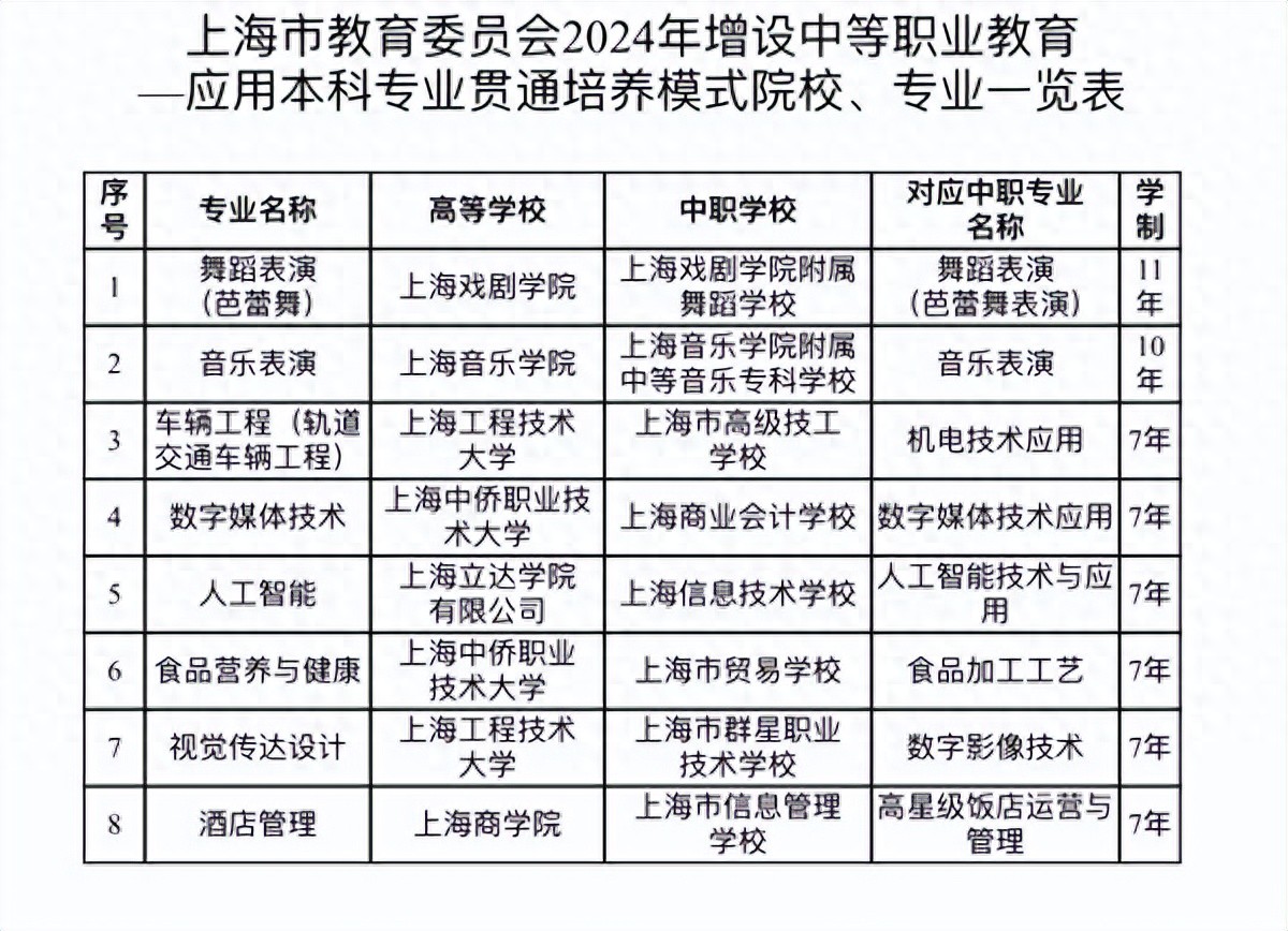 新民晚报讯(记者 陆梓华)2024上海中考考生及家长请注意!为进一步完善上海现代职业教育体系,根据市教委最新发布的文件,经学校申报、专家评议及市教委核定,2024年上海中招将增设上海戏剧学院附属舞蹈学校与上海戏剧学院申报的舞蹈表演(芭蕾舞表演)等8个中职—应用本科教育贯通培养模式专业,相关教育教学及管理要求按有关规定执行经学校申报、专家评议及市教委核定。
