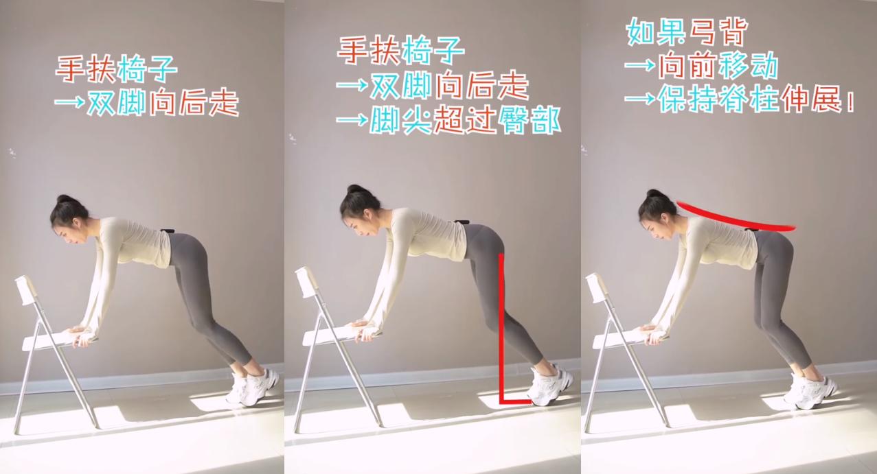 首先准备一把椅子,手扶在椅子两侧,双脚向后走,脚尖超过臀部,背部挺直,如果出现弓背的情况,可以适当前移,保持脊柱伸展。