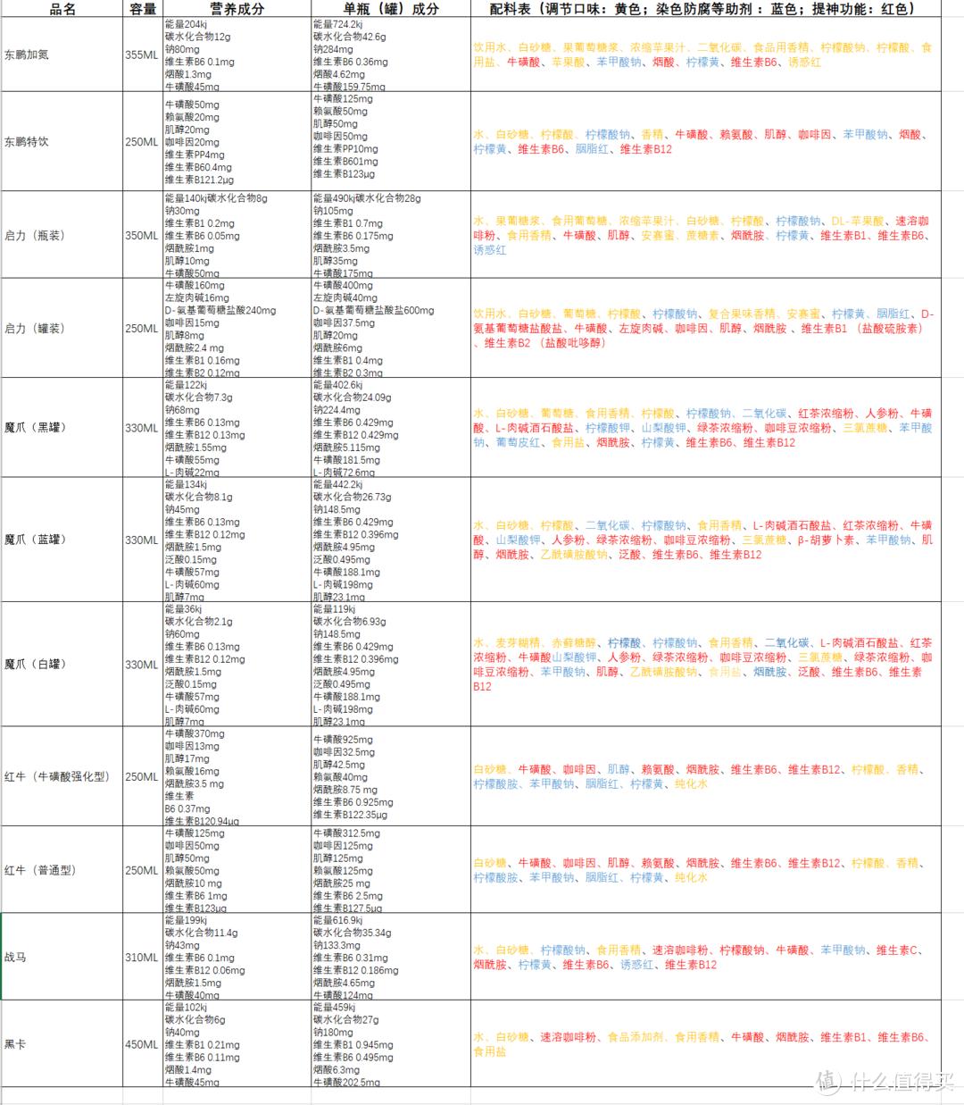 在确定什么最值得买的时候,我们首先要弄清楚,为什么功能性饮料,可以提神?在把11款功能性饮料的营养成分表与配料表都汇总了以后,我发现了几个有意思的地方。