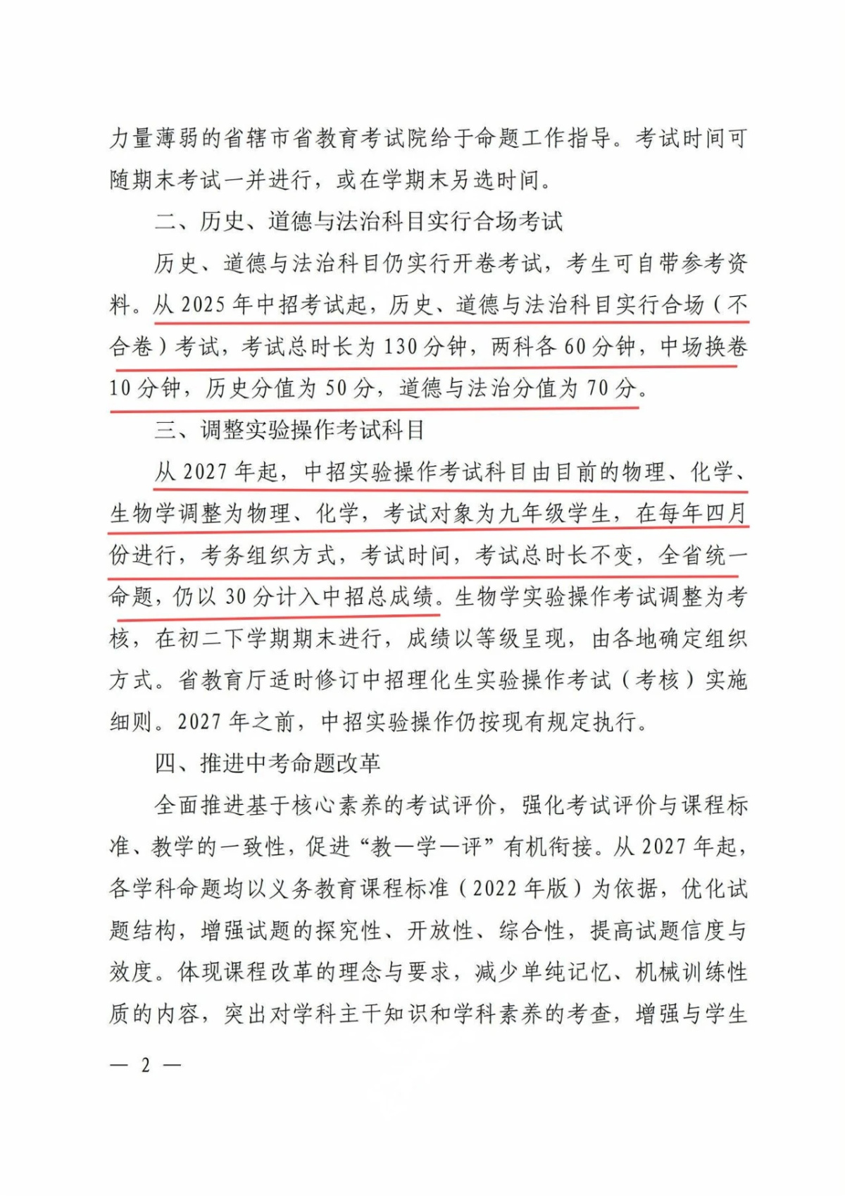 二、2025 年起,历史、道德与法治实行合场(不合卷)考,总时长 130 分钟,两科各 60 分钟,中场换卷 10 分钟,历史分值50分,道德与法治70分。