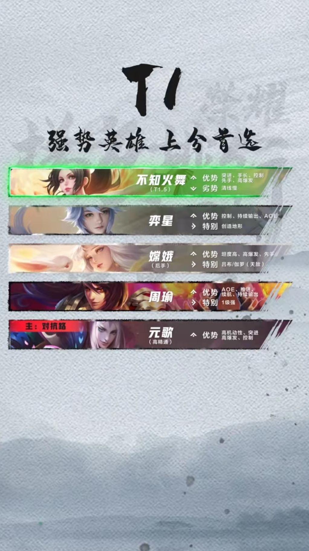 T1:不知火舞,奕星,嫦娥,周瑜,元歌(不推荐,适合绝活哥)。