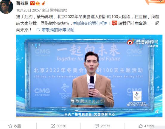 26日晚,萧敬腾还在微博发布宣传北京冬奥委会进入倒计时100天的19秒短视频,邀请大家与他一同点燃冬奥热情。