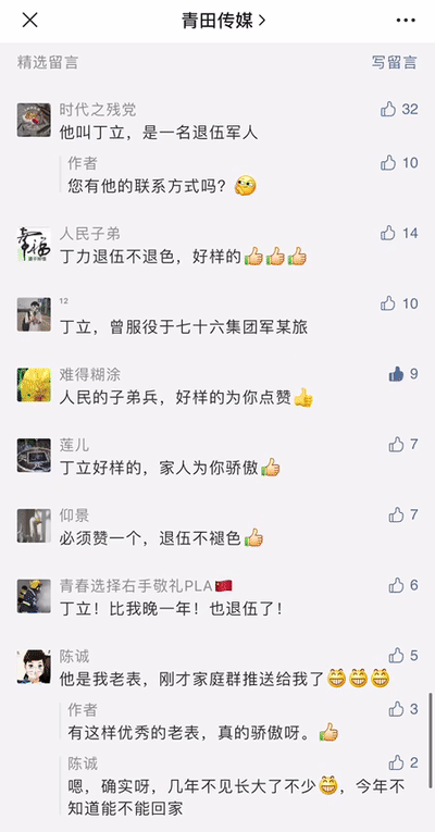 “退伍不褪色,部队让我学到好多,我也时时刻刻提醒我曾经是名军人,时刻要尽到军人应该履行的职责。”丁立在微信朋友圈中说。他的事迹被战友们知道后,大家也都纷纷竖起大拇指。
