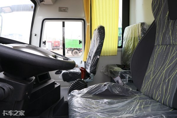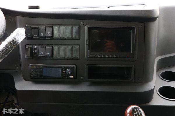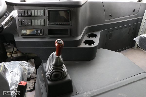 与其他黄牌重卡不同,超龙的驾驶室虽然也是凸地板的设计,但是凸起的高度比较低,出入后座并不费力。副驾侧中控的的位置配置了两个杯架。
