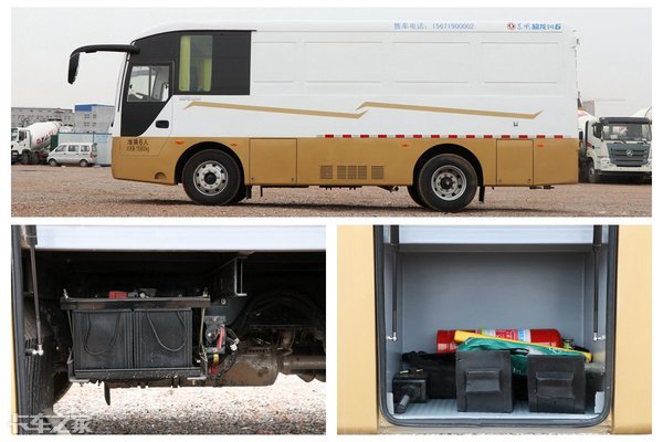 整车长8.245米、宽2.43米、高3.465米。侧面的四个转向警示灯可以让周围的车辆及行人及时领会驾驶员的意图。主驾侧面的两个护板打开后,从前到后依次是电池和储物箱。