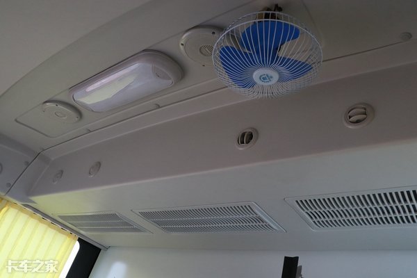 顶部是车载空调,看到这么多出风口就感觉到这空调的制冷制热效果一定很优秀。主驾侧还单独搭配了一个风扇,确保驾驶员在炎炎夏日依旧可以拥有良好的驾乘环境。