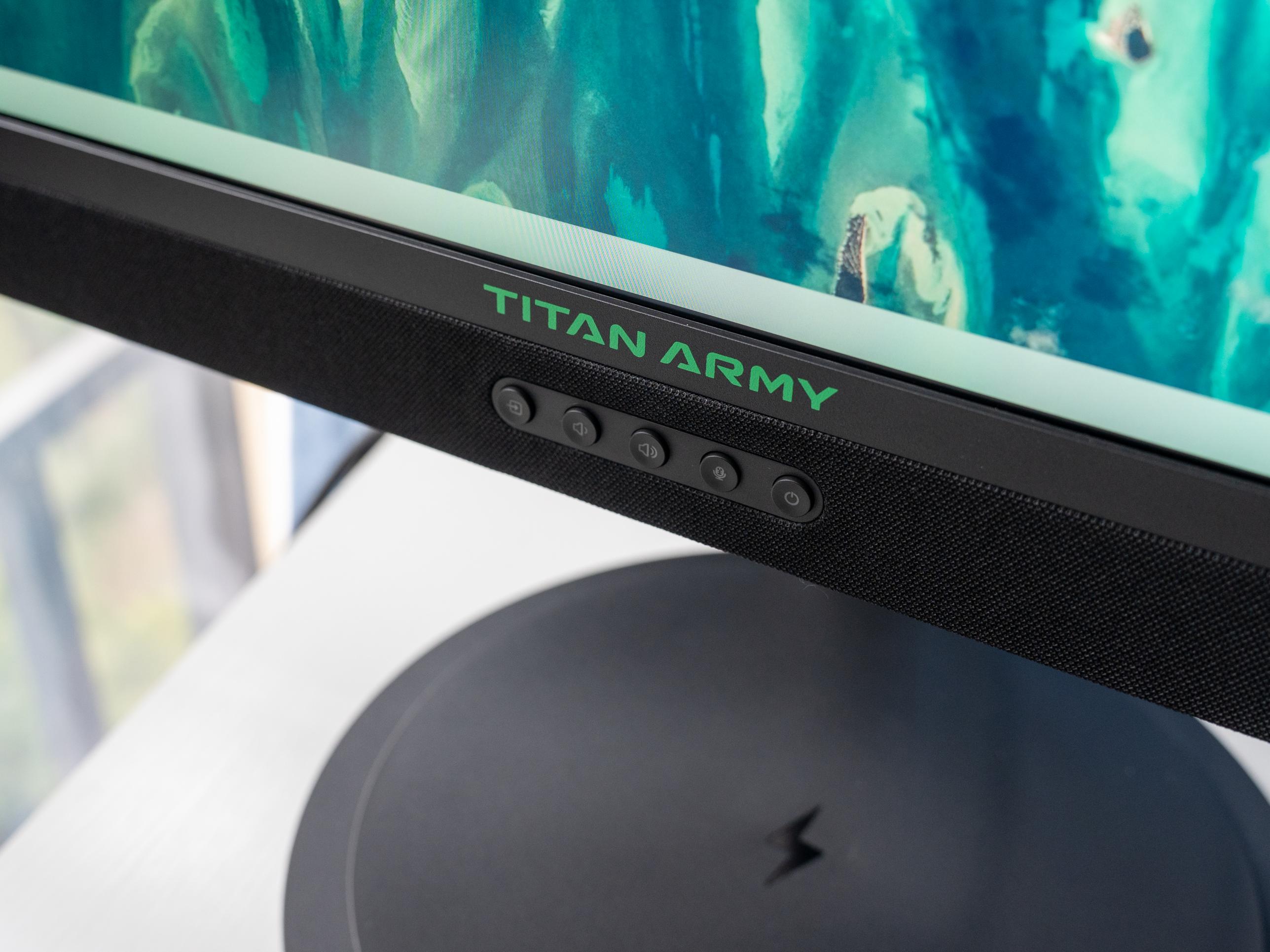 许多朋友可能会好奇,泰坦军团M27E2V的三边已经非常窄了,但是为什么要保留一个宽下巴。这是因为显示器在下巴内集成了2个5W的中高音喇叭和1个12W的低音喇叭,组成2.1声道,就相当于显示器自带了一个回音壁,让我们不需要外接耳机或者音响,就能体验HIFI级别的音效。