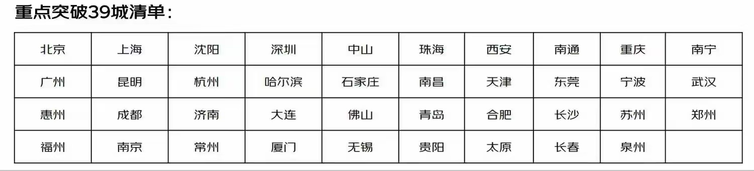 根据一份由京东外卖地推人员提供的重点突破城市名单,京东外卖列出了首批重点推广的39座城市。39座城市中,有24座为省会城市和5座计划单列市,以及东莞、惠州、佛山、苏州、无锡、泉州等地方经济强市。