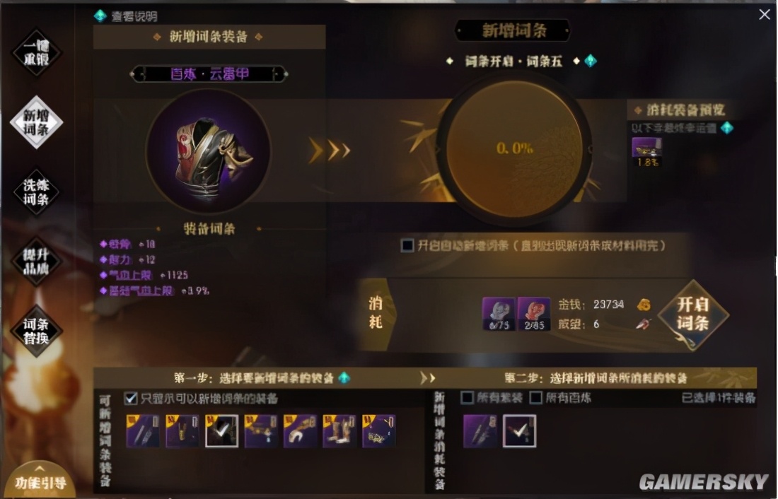 新增词条这个功能是可以提供让这个装备从四孔装备变成五孔装备,但是他的前提是必须要达到一键重锻中两个方案中的一个才可以使用这个功能,狗粮建议使用百炼狗粮幸运值会高一些。