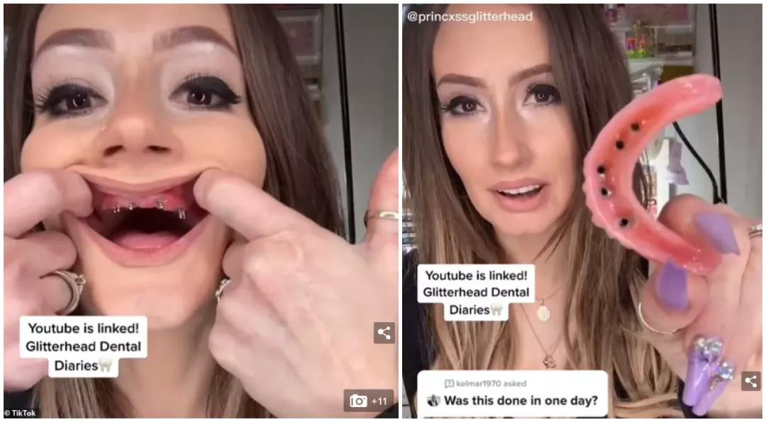 为了佩戴咬合式假牙,她忍着剧痛,在上下牙龈里嵌入了10个微型种植体。