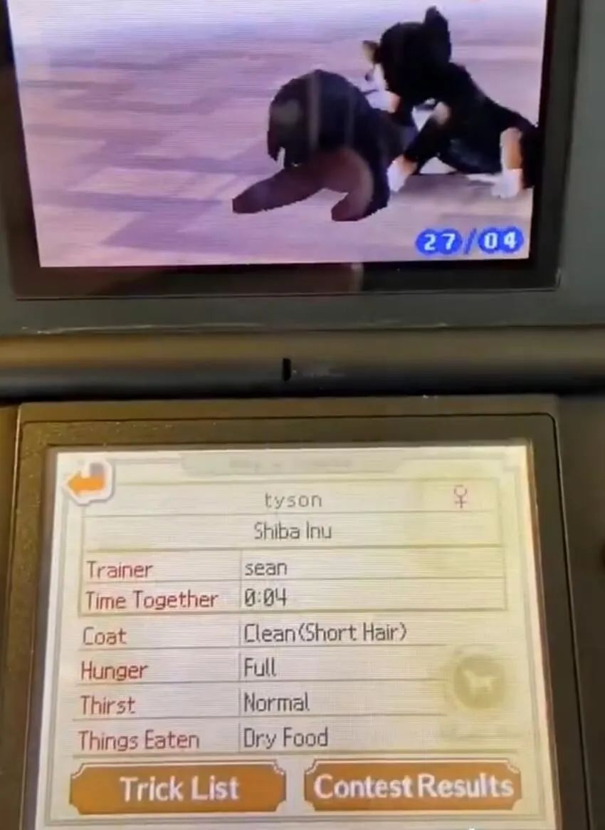 两只小狗来自卡带原主人的存档,在NDS时代大多数游戏的存档都会保存在卡带里。这样做虽然避免了因机器问题导致存档丢失的灾难,但也放大了卡带丢失的损失和二手交易的麻烦,这才有了这两只被捡到的赛博流浪狗。