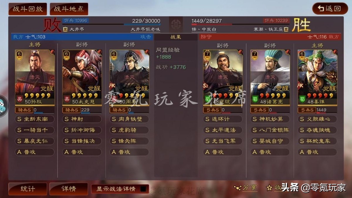 队伍缺点:最大缺点是惧怕盛气和孙凌周的西凉吴骑,前者是突击技能的克星,后者前三回合爆发太高,我方速度不如对方,所以承受不了。