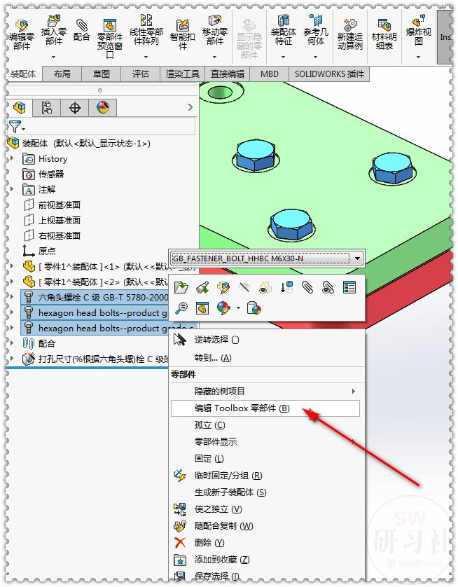 19.【右键】-【编辑Toolbox零件部件】。(垫片和螺母不能同时选择,否则没有这个选项)