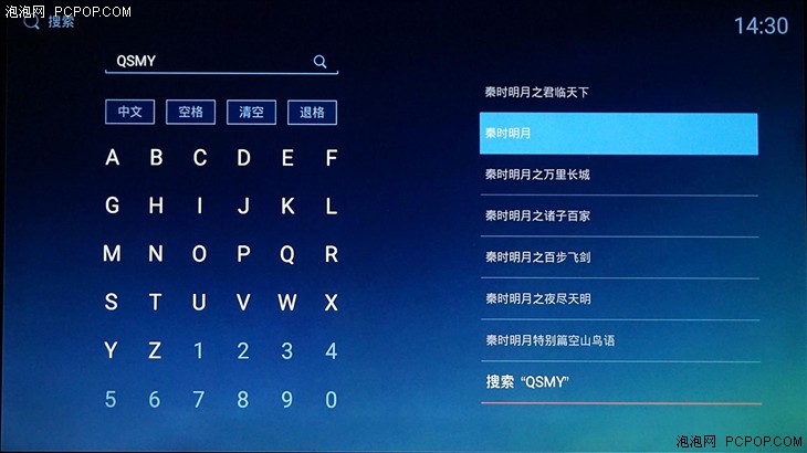 搜索方式支持中文及首字母两种方式,一般情况下通过首字母搜索的方式更为方便一些。26个字母与10个数字键全部排列在一起,非常直观,不过与九宫格按键布局相比,需要遥控器不停的上下左右,步骤可能会更多一些。