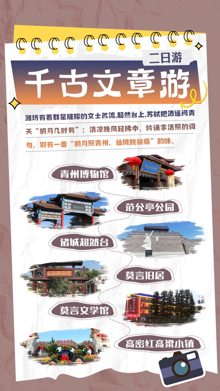 九条线路精彩满满,这个“五一”来潍坊吧!尽情享受路途的自然美景和人文气息,来一场说走就走的旅行~