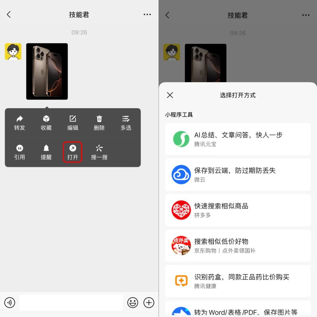 在聊天中长按图片后,菜单栏中新增了“打开”按钮,点击即会弹出小程序列表,可以选择在哪个小程序中快速打开这张图片。例如,可将图片上传至腾讯元宝中进行解析、上传至拼多多/京东进行商品搜索比价、上传至微云云端保存等等。