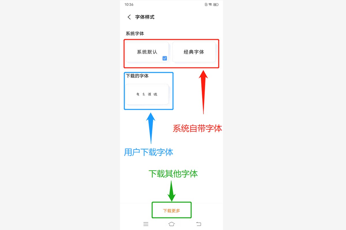 点击进入“字体样式”选项,会看到系统默认的两款字体,分别为“系统默认”和“经典字体”,以及用户自行下载的其他字体。如下图: