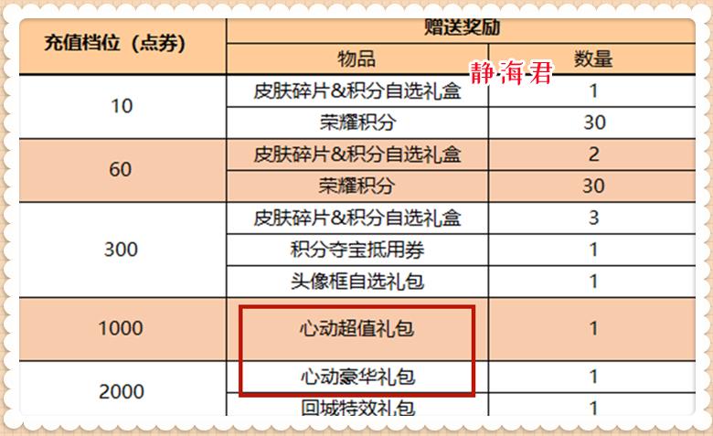 充值满1000点券可以获得心动超值礼包,打开该礼包可以选择战令币×40的奖励;充值满2000点券可以获得心动豪华礼包,打开该礼包可以选择战令币×80的奖励。