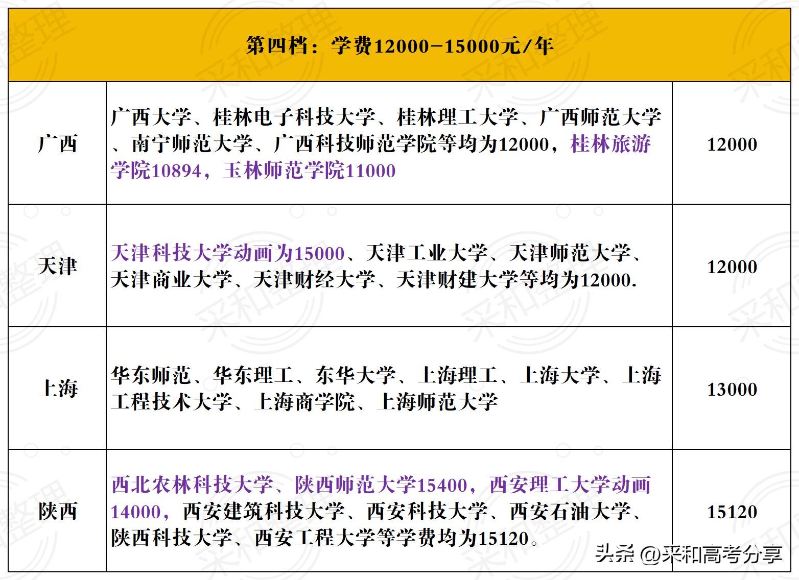 第四档的省份包括:广西、天津、上海、陕西,学费区间在12000-15000,也就是学费明显过万的省份。