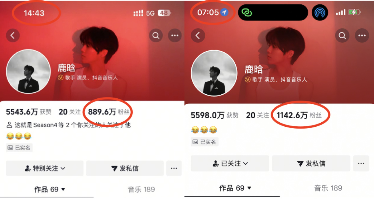 7月5日,恰逢鹿晗青岛演唱会第二场举办之日,其多平台账号“关注”功能恢复正常。有网友记录显示,在随后的约16小时内(从当天下午约3点到次日7点),鹿晗抖音账号粉丝数暴涨250多万。