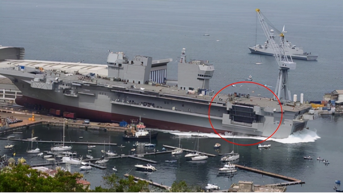 图:意大利的里雅斯特号两栖攻击舰下水时画面,升降机被折叠
