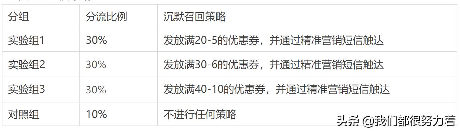 业务团队目前正在做沉默用户召回,想验证不同的召回发券策略的效率,并在接下来的召回运营中推广使用效率最高的策略。此时的实验目标:找到召回沉默用户效率最高的策略。