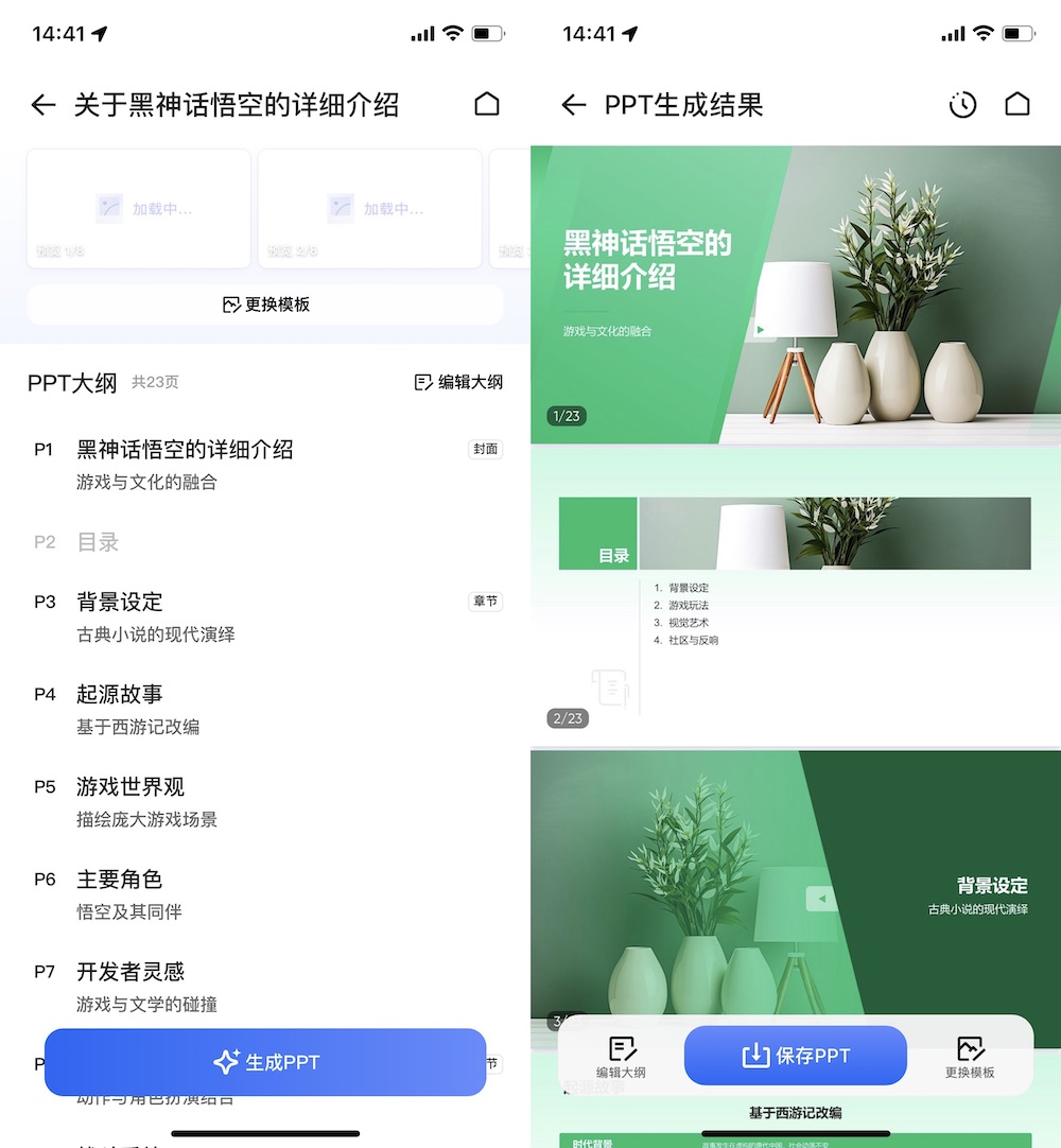 PPT 制作方面,我们让夸克 AI 生成有关《黑神话:悟空》的详细介绍,App 首先生成了大纲,进一步点击“生成 PPT”就得到了截图中展示的结果。尽管模板支持修改,但这默认的风格实在是有点……