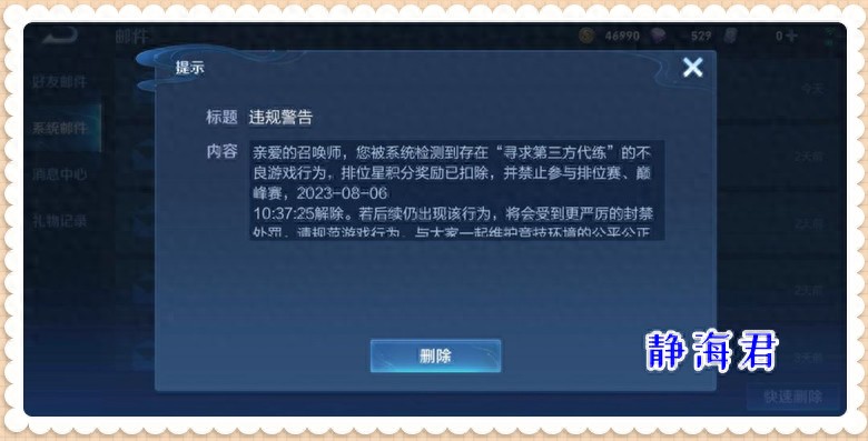 据他所说,这张图是他朋友的,只因为开小号炸了下鱼就遇到了被扣星的情况,被扣星的原因说是被系统检测到存在“寻求第三方代练”的不良游戏行为。