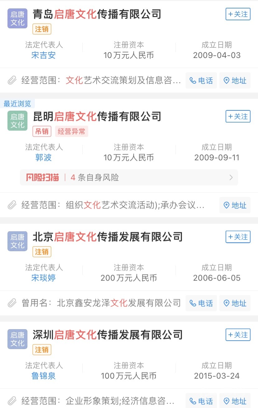 启唐文化多家下属分支机构经营状态异常。(来源:企查查平台截图)