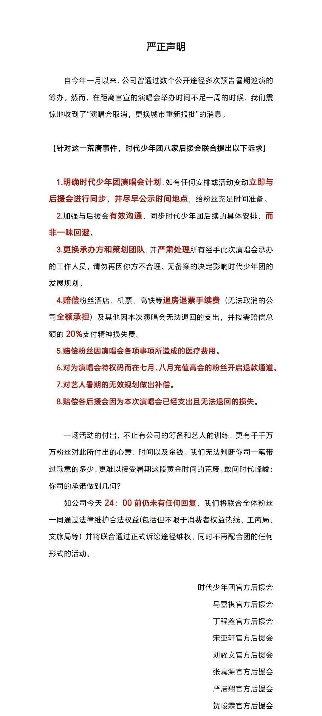后援会提出,请时代峰峻明确时代少年团演唱会计划,尽早公示时间地点,给粉丝充足时间准备;赔偿粉丝酒店、机票、高铁等退票手续费及其他因演唱会无法退回的支出等。