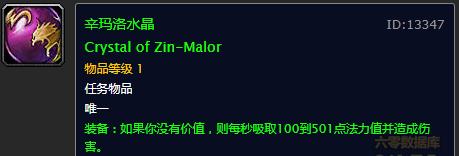 在对战20人团本安其拉废墟中的最后BOSS:无疤者,T都会用到一个物品防止被BOSS控制,这个物品就是辛玛洛水晶。同理,它能够运用在pvp中,带上之后你会持续掉血,可以破解很多控制技能(羊、盲、驱散、冰冻、魅惑等等)当然你需要提前调整好流血量,防止自己被流死。