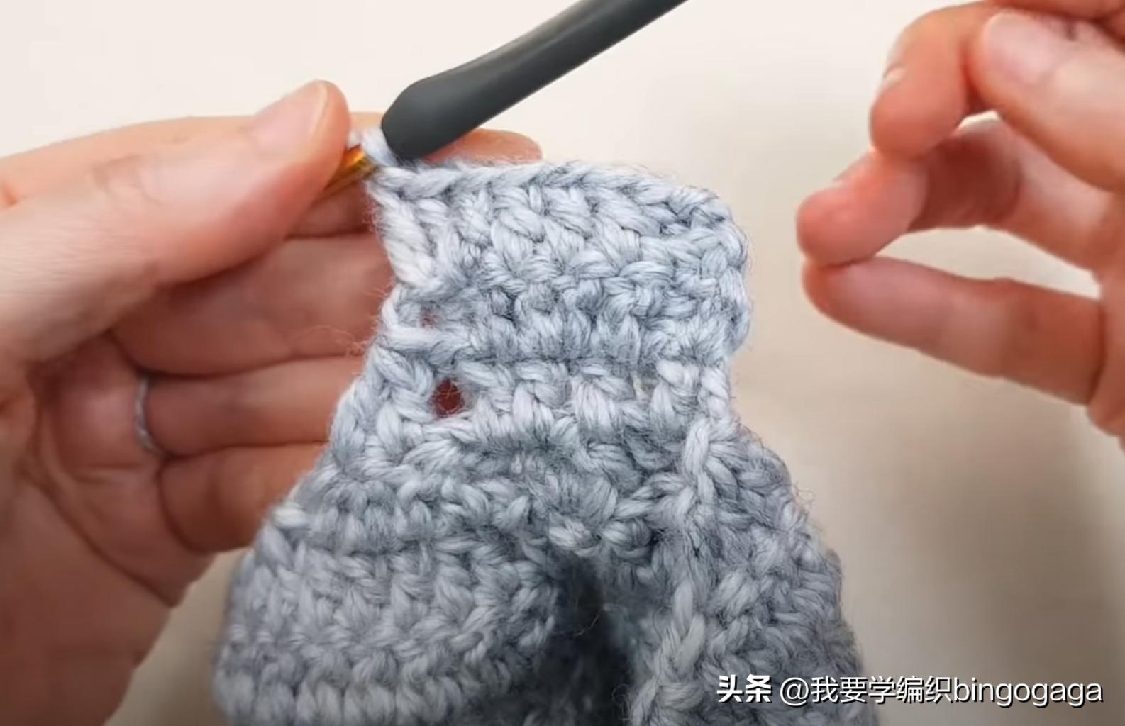 起针数为偶数针,示范款起了36针。第1行:1锁,不加不减36短;第2-14行:来回翻面钩36短。接着两个侧边分别加上3个记号扣,位置如图3-4,先向侧边引拔1针(如图5),然后3锁,后面每个记号扣行里挑钩2针长针,其它行里都是挑钩1针长针,侧边一共挑出了17针;长边每1针里挑钩1针长针,共36针;所以一圈挑钩完后,总针数为36*2+17*2=106针,引拔,断线。